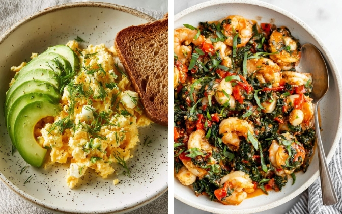 - Breakfast: Creamy Greek Yogurt Bowl – Mix ¾ cup plain full-fat Greek yogurt with 1 tbsp chia seeds and ¼ cup raspberries. (235 kcal | 18g Protein | 10g Fat | 9g Net Carbs)