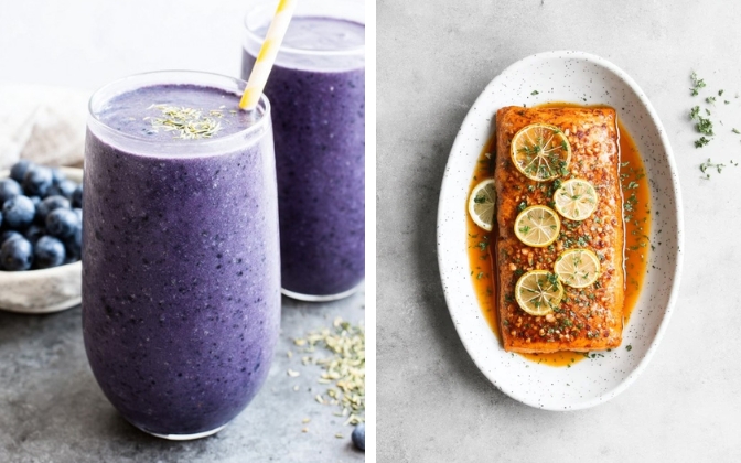 - Dinner: Easy Foil-Baked Lemon Garlic Salmon – Serve with 1 medium baked sweet potato (skin on) and steamed asparagus. (530 kcal | 34g Protein | 28g Fat | 38g Carbs)