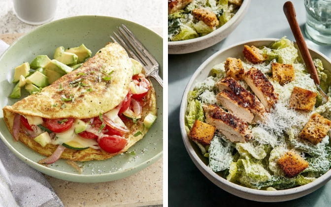- Breakfast: Farmer’s Market Veggie Omelet – Serve with 1 slice whole wheat toast and 1/2 cup grapes. (360 kcal | 16g Protein | 20g Fat | 30g Carbs)