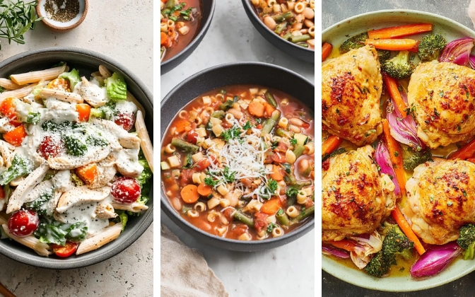 - Lunch (367 cal): Creamy Chicken Caesar Pasta Salad (240 cal) with a 1-cup side of Easy Homemade Minestrone Soup (approx. 127 cal).