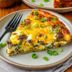 Low Carb Breakfast Casserole - slice of sausage and mushroom egg bake with green peppers and green onions on a white plate