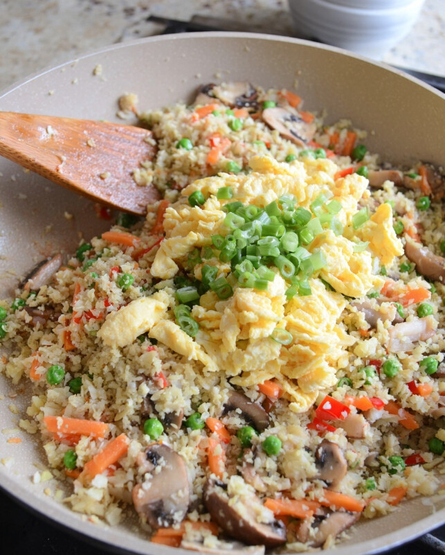 - Finishing Touches: Reduce the heat to low. Drizzle in the rice vinegar and the toasted sesame oil. Add the cooked scrambled egg back to the pan along with the reserved dark green scallion tops. Gently toss everything together to combine without breaking up the cauliflower too much.