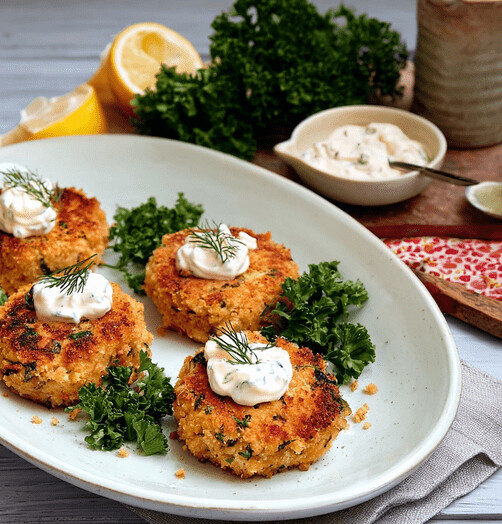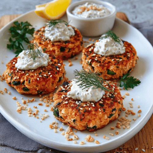 Golden Low-Carb Salmon Cakes with Tangy Herb Sauce