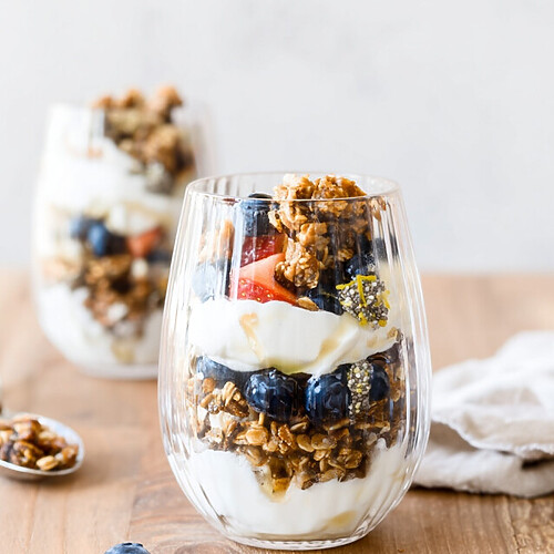 The beauty of this DASH diet yogurt breakfast is that it’s flexible. If you don’t have blueberries, use strawberries. If you’re out of granola, crush up some nuts. But sticking to the ratio is key for that perfect bite.