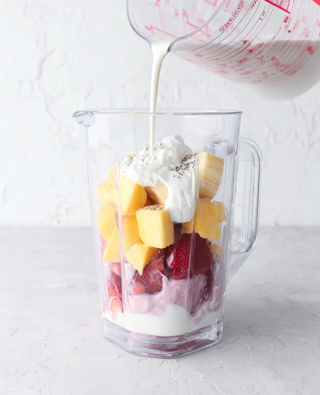- Combine Ingredients: Place the frozen mango, frozen strawberries, banana chunks, plain non-fat Greek yogurt, low-fat milk, chia seeds, and fresh lemon juice into the pitcher of your blender.
