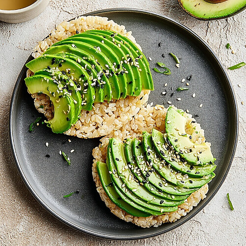 - Top and Garnish: Evenly arrange the seasoned avocado slices over each rice cake. Drizzle approximately 1/2 teaspoon of low-sodium soy sauce (or coconut aminos) over each. Finish by sprinkling each with 1/4 teaspoon of black sesame seeds.