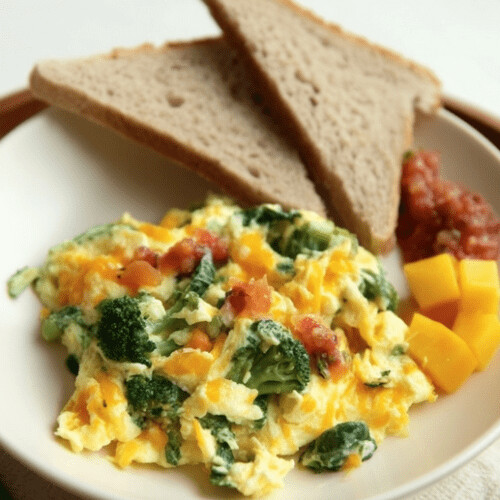 Wake up to a skillet of fluffy eggs and egg whites loaded with garden veggies, a sprinkle of sharp cheddar, and fresh chives. On the side, golden whole wheat toast, zesty salsa, and chilled mango cubes come together for a colorful plate that feels cozy, satisfying, and easy enough for any busy morning. With plenty of protein, vegetables, and whole grains, it is a feel good breakfast for two that fits right into a DASH style way of eating without ever tasting like “diet food.”