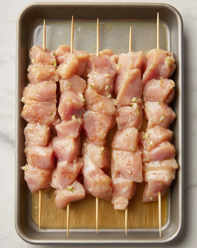 - Assemble the Skewers:Once the chicken has had its lovely marinating spa day, it’s time to thread the pieces onto your prepared skewers. Try to distribute the chicken evenly. I usually aim for about 4-5 pieces per skewer if I’m using 4 main skewers, but you do you! Any marinade left in the bag or bowl? Just discard it.