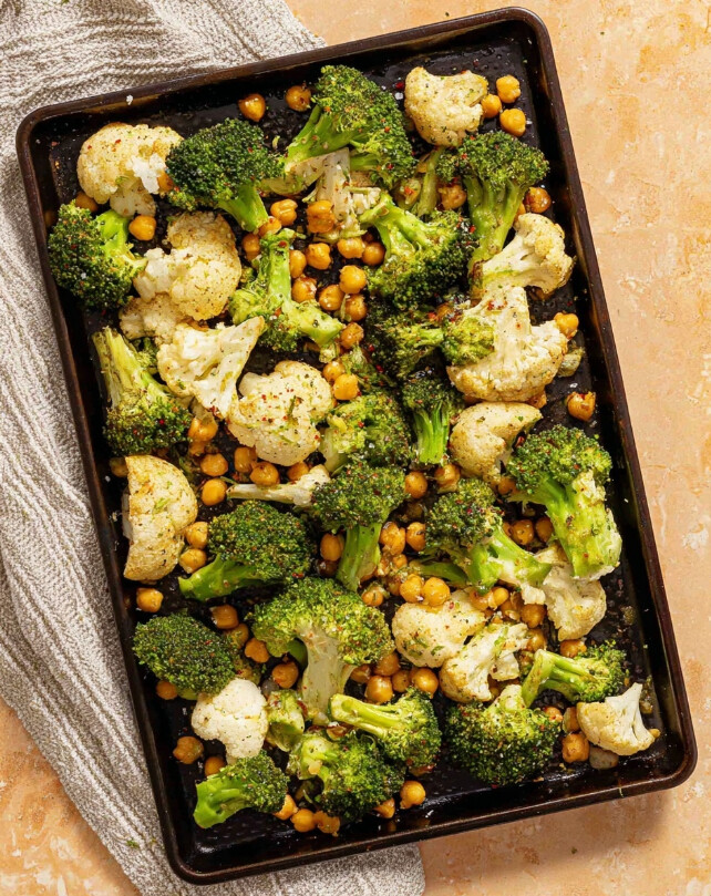 • Prep the Veggies: You’ll chop the broccoli and cauliflower, drain and pat the chickpeas really dry (that’s the key to getting them crispy!), and toss it all with olive oil and garlic powder.